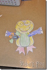 We read a cute little story about Fredrick the Frog. He is a very handsome amphibian who lived in Lily Pad Pond. He liked to to be noticed, so he would fill his throat with air until it looked like a balloon and make the deepest, froggiest croak of all of the male frogs. We learned that he is a vertebrate because he has a backbone. We learned about the life cycle of a frog, and how they go through many changes called metamorphosis. They start out as an egg, then become a tadpole. At this point they grow legs, and loose the tail. Then they are a Frog. We also learned that Frederick hibernated in Lily Pad Pond for the winter, and will wake in the spring. A sure sign that spring has sprung is when we hear the croaking of the frogs. It was a very cute little story.